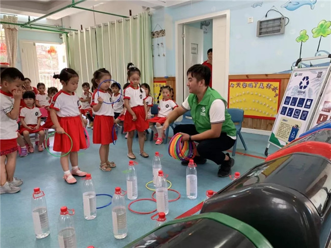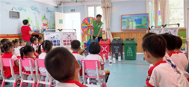 通俗易懂的講解后,孩子們對(duì)垃圾分類有了一個(gè)初步的認(rèn)識(shí)。接下來開展孩子們喜歡的游戲互動(dòng)環(huán)節(jié),通過“垃圾分類問答轉(zhuǎn)盤”、“分類套圈圈”的小游戲,孩子們?cè)跉g聲笑語中學(xué)習(xí)到了豐富的垃圾分類知識(shí)。