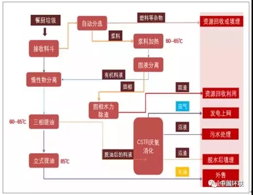 餐廚垃圾的特點包括有機物含量高,含水率高,易腐爛變質,易發(fā)酵、發(fā)臭,主要是采用厭氧消化、好氧堆肥和飼料化工藝等生物法進行處理。其中厭氧消化工藝能最大化回收油脂,無害化程度高,并能夠充分地對餐廚垃圾中的有機物進行資源化回收和利用,已經有超過70%的餐廚垃圾處理項目使用這條技術路線,是現(xiàn)階段的主流工藝路線。