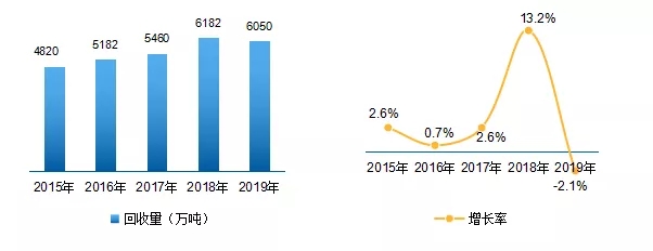 2015-2019年我國紙回收量及增長速度