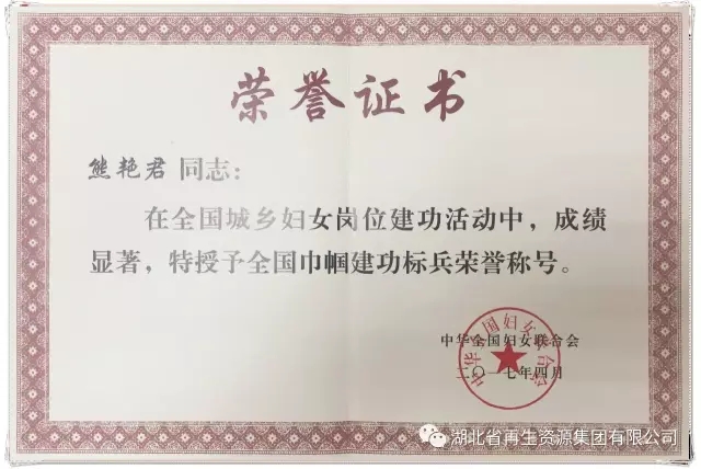 近期,中華全國婦女聯(lián)合會作出“關(guān)于表彰全國巾幗文明崗、全國巾幗建功標(biāo)兵、全國巾幗建功先進(jìn)集體的決定”(婦字〔2017〕17號),湖北省再生資源集團(tuán)有限公司總經(jīng)理熊艷君同志被授予“全國巾幗建功標(biāo)兵”榮譽(yù)稱號,這是我省供銷社系統(tǒng)中唯一獲此殊榮的先進(jìn)個人,也是全省受表彰的30名先進(jìn)個人之一。